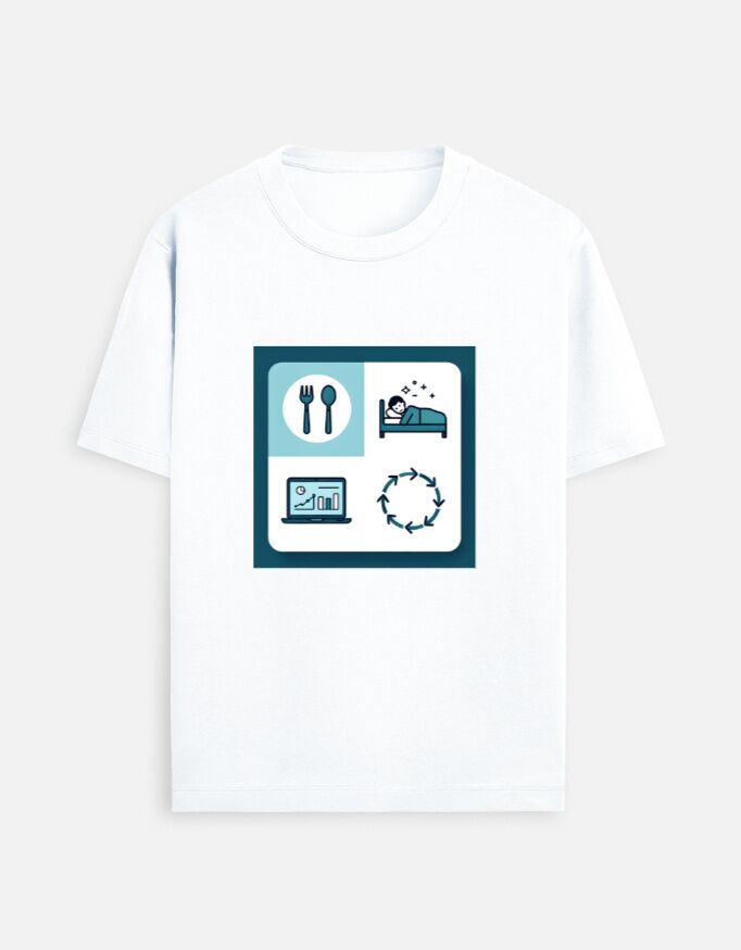 Celebrate the rhythm of modern life with our Unisex analytics t-shirt showing the daily cycle of life”, designed to resonate with the vibrant Indian audience! This trendy t-shirt features a bold and thought-provoking graphic of a laptop displaying a graph, a sleeping man, a fork and knife, a bed, and a repeat sign. Whether you’re hustling at work, enjoying a hearty meal, or catching up on sleep, this design captures the essence of life’s repetitive yet beautiful cycle. Crafted from 100% premium cotton, this t-shirt offers unmatched comfort and breathability, making it ideal for India’s diverse climates – from bustling city streets to laid-back evenings with friends. The vibrant but sober print is sure to grab eyeballs.