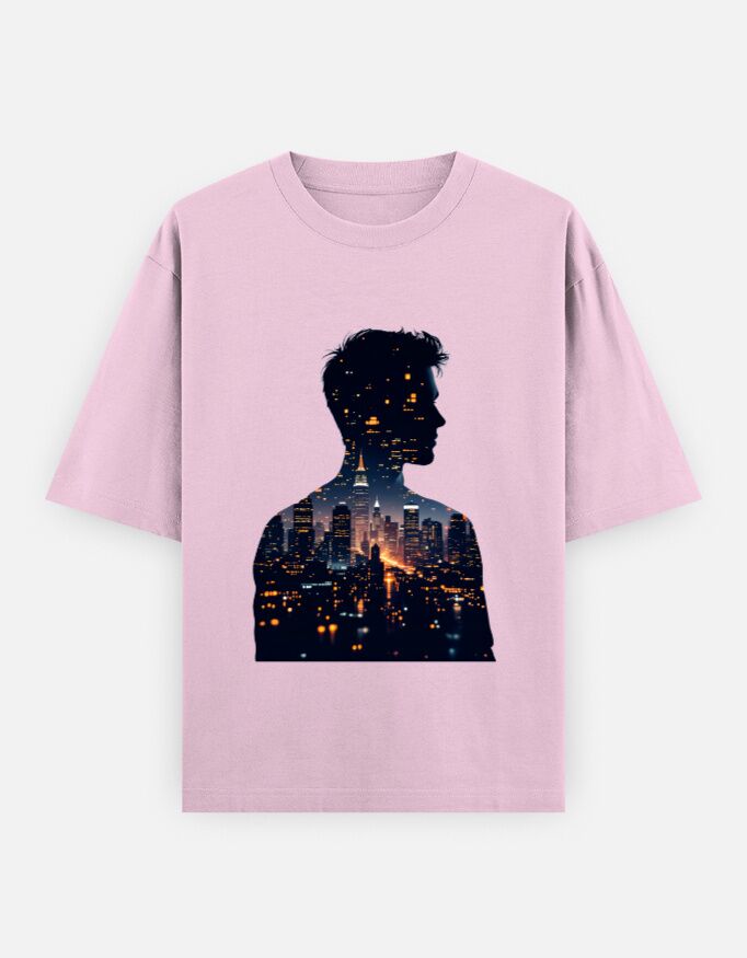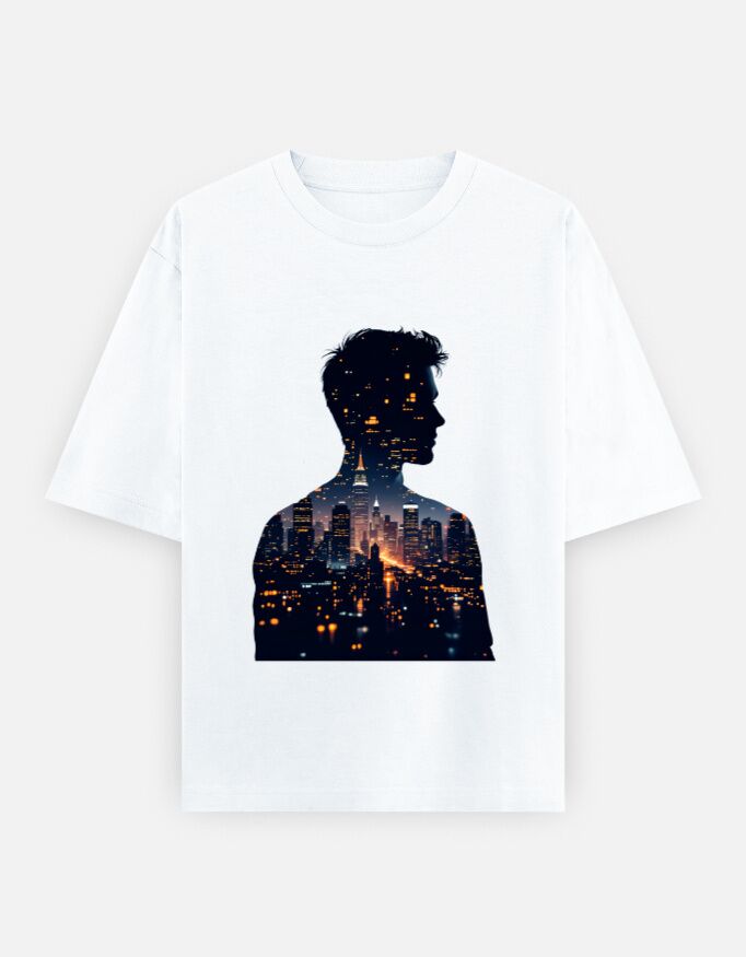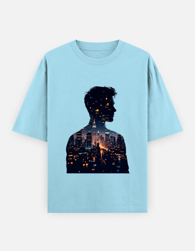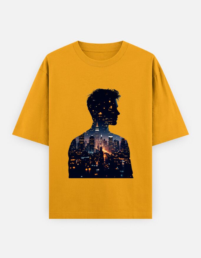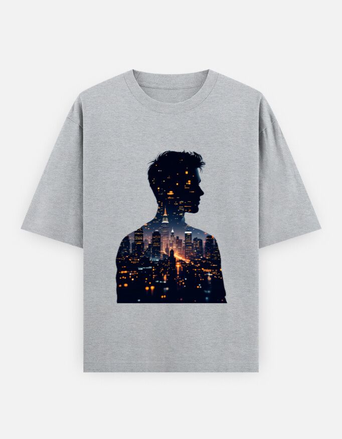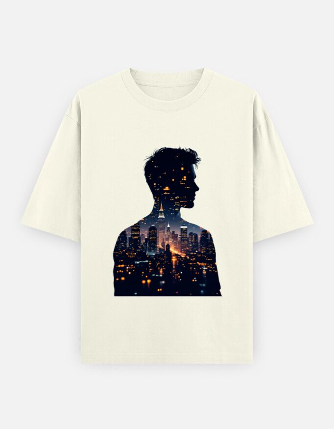 Look closely at this unisex t-shirt and you’ll see it: a striking silhouette of a man, but inside him, an entire glowing city comes alive – towering skyscrapers piercing the sky, twinkling lights stretching endlessly, bustling streets pulsing with energy. It’s not just a print. This man city t-shirt captures the soul of modern India.